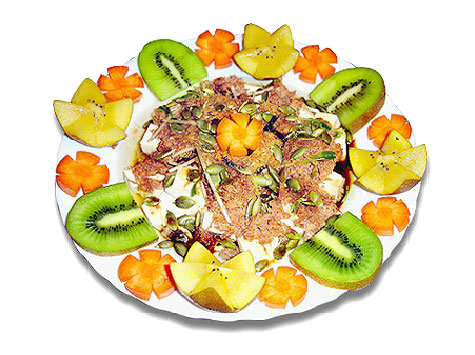 (4) 将素干贝丝铺在(3) 后,再撒上一层素肉松,接着撒上南瓜子。