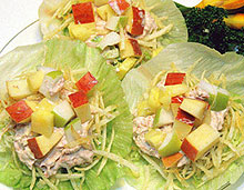 5、将每一片圆形碗状莴苣叶,依序放入莴苣细丝、马铃薯丝、干贝丝色拉以及水果丁即可。