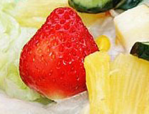 2. 将小黄瓜、红椒、黄椒、素火腿、苹果切丁、菠萝切小片,与马铃薯丁、玉米粒一起放入盘子,加上色拉酱搅拌均匀,就是一道营养开胃的色拉。(也可以加上其它喜欢的水果)