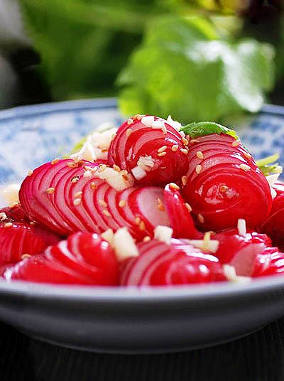 樱桃小萝卜、花椒油、糖、醋、香油、芝麻。