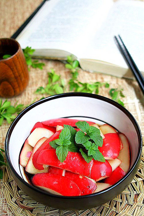 原料:萝卜,盐,糖,香醋,蘑菇精,香油