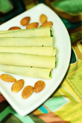5将切好的千张片拿起一张铺平,沿着长边将混合好的菜泥放在千张片的前端,像卷寿司一样,卷成一个个蔬菜卷就成了。