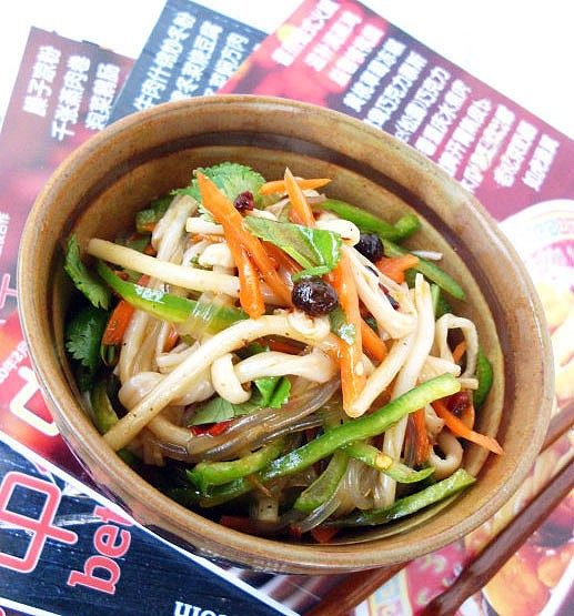 【原料】:金针菇胡萝卜尖辣椒细粉丝咸菜疙瘩一小块