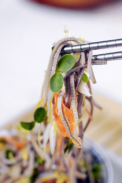 6、将香椿苗和三丝混合,加入素蚝油,糖,醋调味,制作完成。