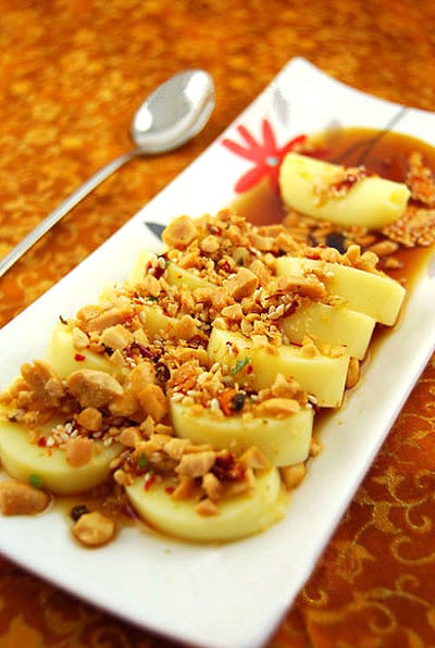 原料:玉子豆腐1条、生抽、盐、醋、白芝麻、糖、麻辣花生。