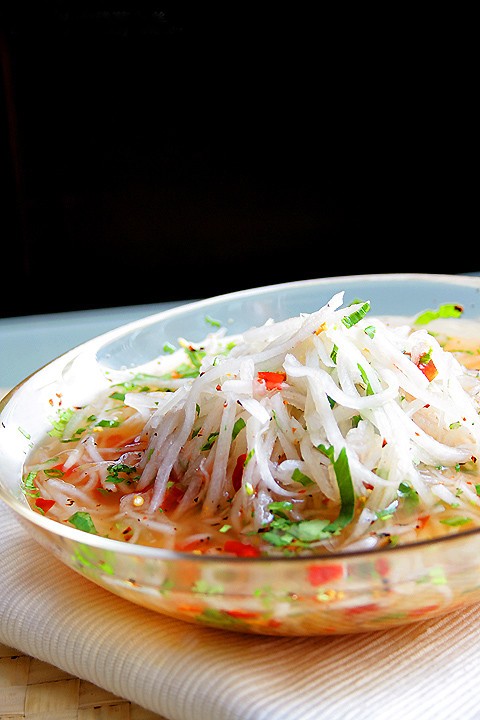 原料:白萝卜,盐,糖,蘑菇精,陈醋,香油