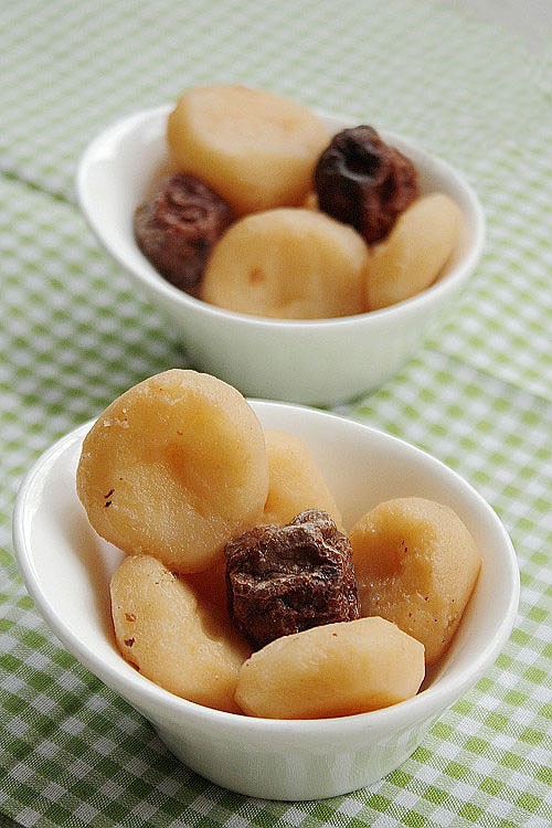 4.如果想更清爽的话,可以把话梅马蹄连汤一起放到保鲜盒里放到冰箱里冷藏一段时间,凉着吃口感更好,马蹄更脆!