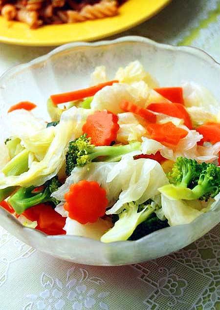 ★嫩卷心菜半颗(撕成片)、胡萝卜一个(切片)、西兰花一小朵(掰成小朵)