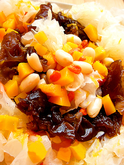 材料:木耳 银耳 南瓜 花生 枸杞 冰糖 盐 米醋 番茄酱 淀粉