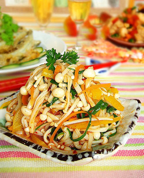原料:金针菇、黄甜椒、生抽、香醋、香油、蜂蜜(糖)。