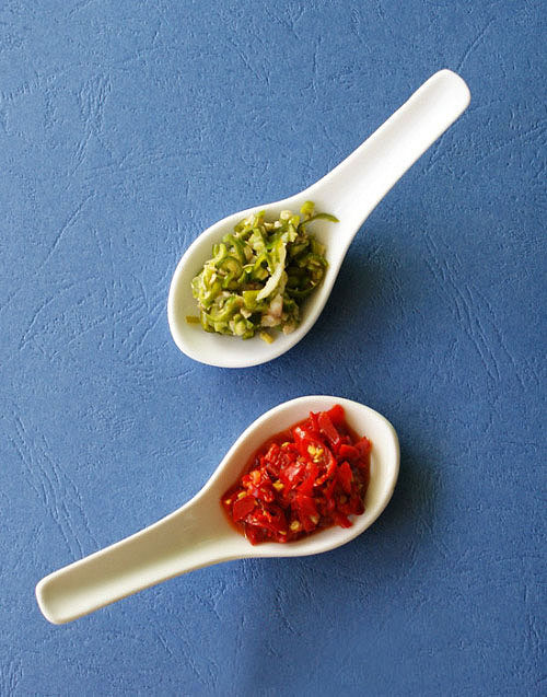 原料:青、红辣椒各1斤,姜2块(每块为2个拇指盖大小),盐