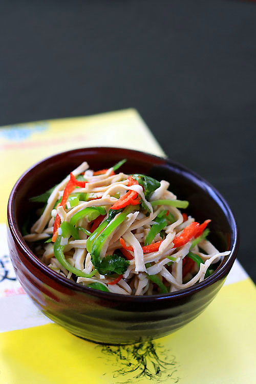5,将白干丝,青红椒丝,加入调味料搅拌好即可。