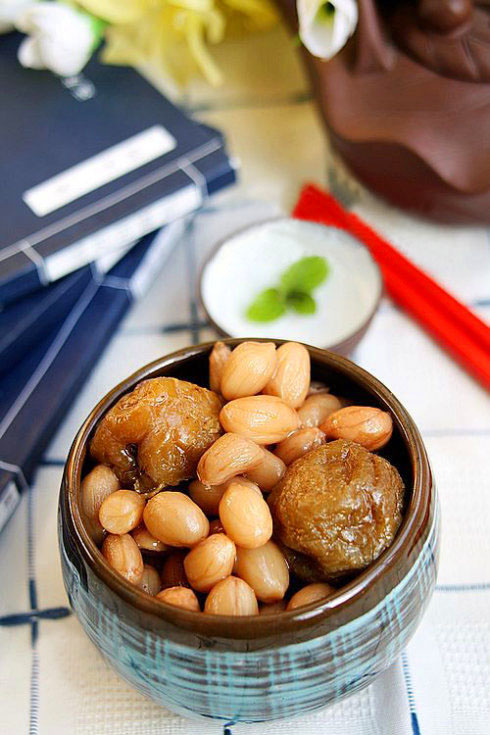 6、开大火煮开后转中火炖40分钟直到把水收至于花生平行为止