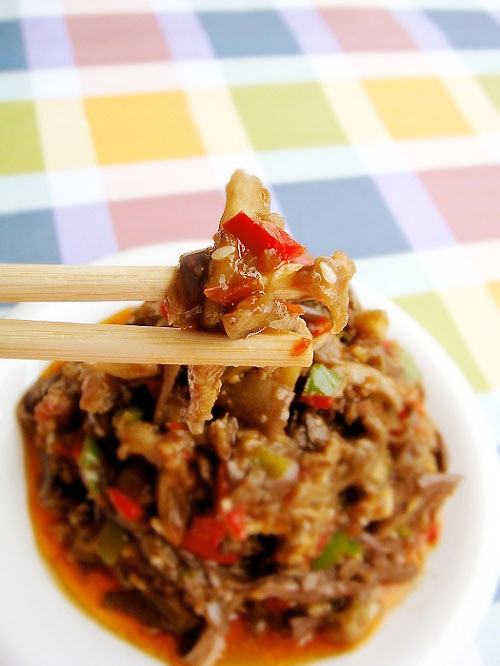 2. 蒸茄子的功夫,把青红椒切碎末;另取一小碗,用2勺酱油,2勺辣椒酱,1勺香油调成汁; 茄子蒸好后,至通风处晾凉,冷却后切成细丝;
