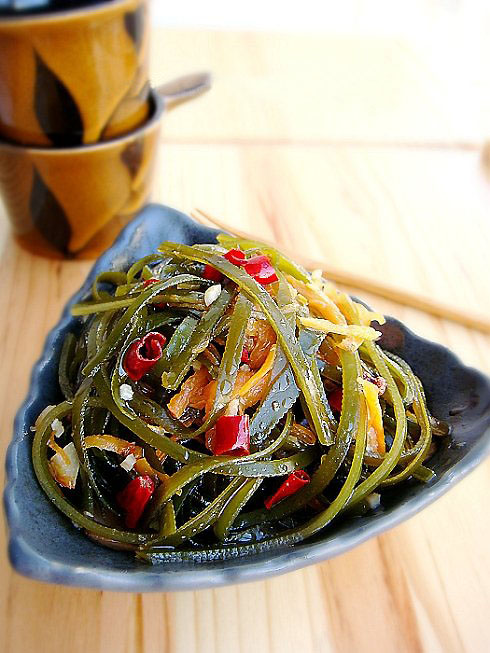 鲜海带,切成细丝,用水焯熟了,加上葱碎、蒜碎、辣椒碎用热油小炝一下,放了美极酱油、凉拌醋、盐、糖,味道还不错。