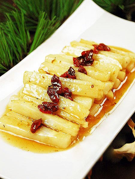 原料:山药500克、枸杞20克、糖150克、桂花酱2茶匙(10ml)、油。