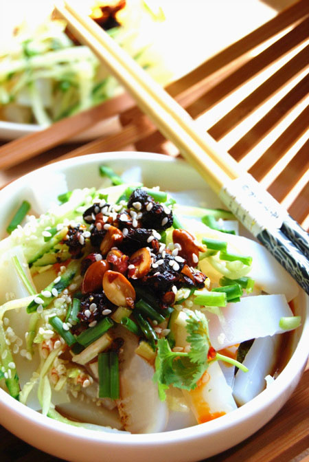 b:香醋、生抽、老干妈、香油、盐、香菜、白芝麻、花生米。