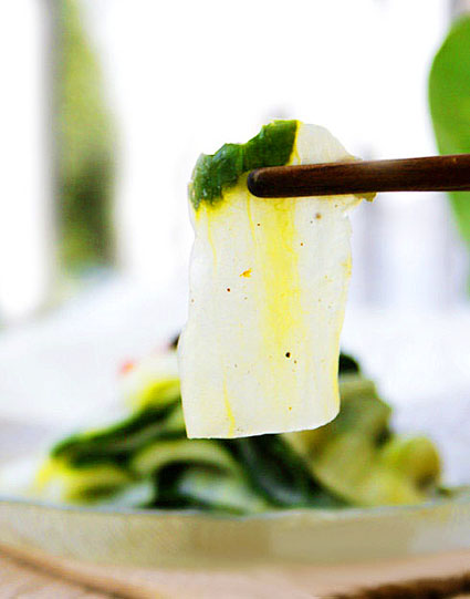 2、右手用利刀平直与菜板平行,左手摁住黄瓜段,刀面帖着菜板进刀,一点一点从右至左慢推,左手摁住黄瓜段,并随着进刀方向和速度,将黄瓜段向左滚。直至片出厚薄一致,不间断的黄瓜片。剩下的当中一段瓜籽,就不要了。