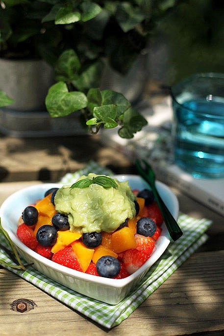 6.把牛油果酱盛在水果块上,吃的时候拌匀即可。