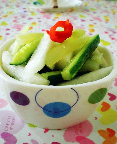 材料:梨子1个,青瓜半条,西芹100克,白糖适量(依个人口味放),白醋适量;