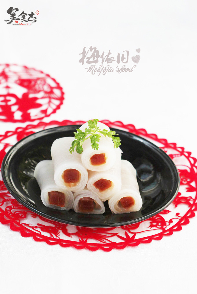 第7步将调好的糖醋汁倒在萝卜卷上,再淋上糖桂花,腌2小时左右即可