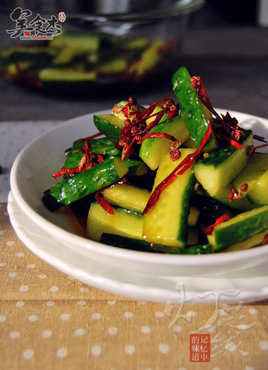 第3步起油锅,小火炸香花椒和干辣椒,趁热浇在拌好的黄瓜条上,吃时拌匀