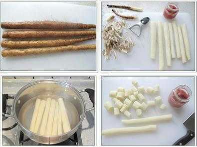 2、 山药洗净去皮,冲洗干净马上放入锅中,大火煮熟(8分钟左右)。