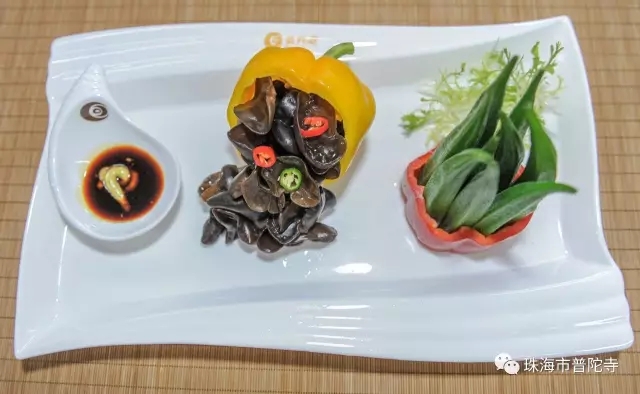 3、将秋葵、木耳、美人椒圈如图摆入盘中,跟上芥末、酱油即可。