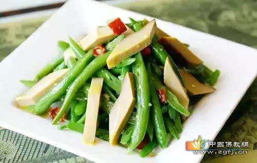4、四季豆片堆放在盘子中间,豆腐干片放于周围,酱油、味精、精盐、姜末、白糖、花椒油兑成调味汁,浇在豆腐片盘中即成。