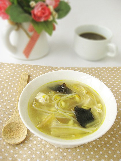 1、材料:金针菜、黑木耳、豆芽、豆腐,豆腐切块用开水浸泡,豆芽、金针菜洗净切段,木耳泡发去蒂。
