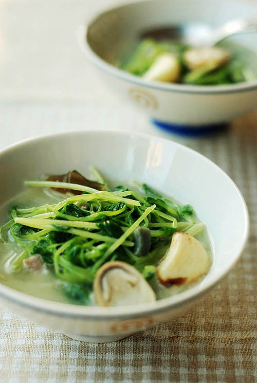 材料:豌豆苗300克、草菇7-8枚、蒜4瓣