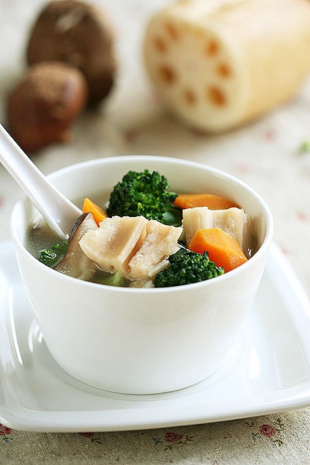 1. 将莲藕洗净去皮拍成段,香菇洗净切片,西兰花洗净撕成小朵,胡萝卜洗净去皮切滚刀块备用;