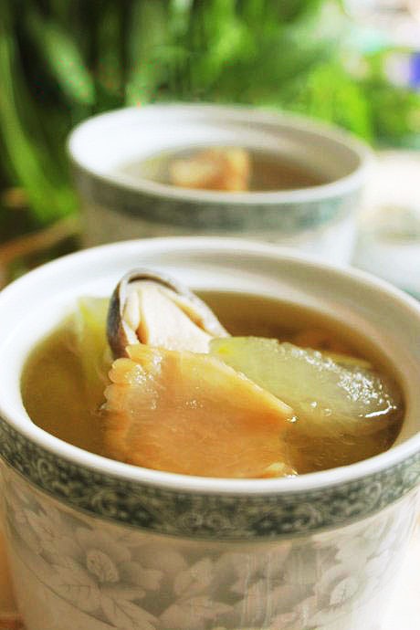 2、取一个砂锅、加入水、先放入姜片、和切好的萝卜干、煮开后再加入切好的冬瓜和草菇、加入少许盐、和蘑菇粉调好味、慢火煲煮30分钟左右、滴入少许芝麻油、关火盛入盛器中即可。