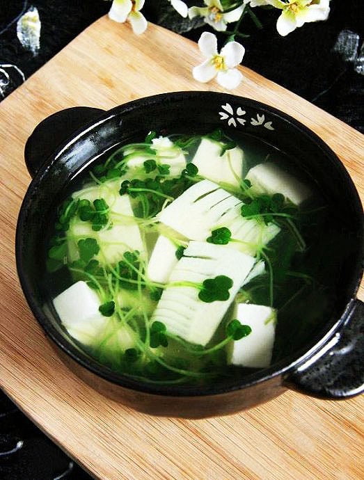 1、冬笋去壳,切成片,嫩豆腐切成小块,萝卜苗洗净