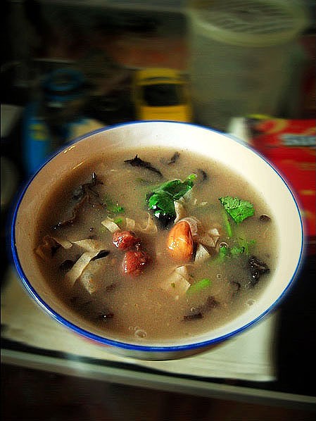 原料:胡辣汤料、素高汤、花生(提前一晚浸泡,与素高汤同煮取出)、海带、豆皮、木耳、红薯粉丝。