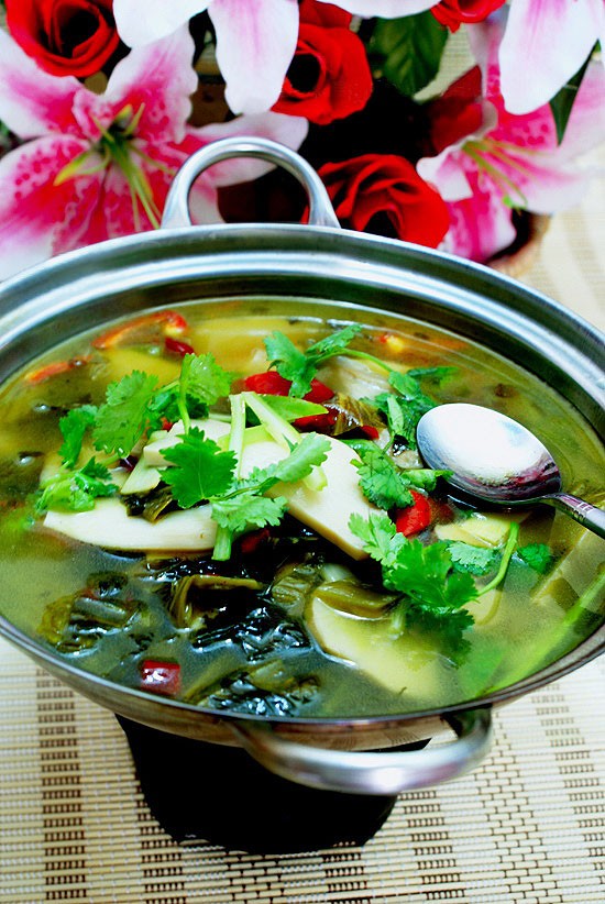 (6) 起锅,放入精制油50克, 放入姜片、芹菜段爆香,加入酸咸菜小火煸香大约1分钟左右,放水1千克改大火,烧开2到3分钟,放入干辣椒改用小火, 放盐2克、素易鲜(代替味精) 3克、白醋5克,下入杏鲍菇、下入青红椒煨制一下出锅,装在锅仔内香菜点缀即可。