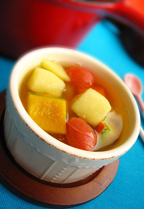 材料:小番茄300克、小南瓜1个、红萝卜1根、富士苹果一个,清水800克、蜂蜜1大勺。