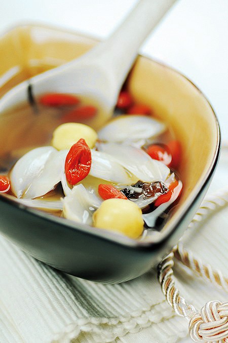 2):莲子洗净后用温水泡软,枸杞子洗净后用清水浸泡备用