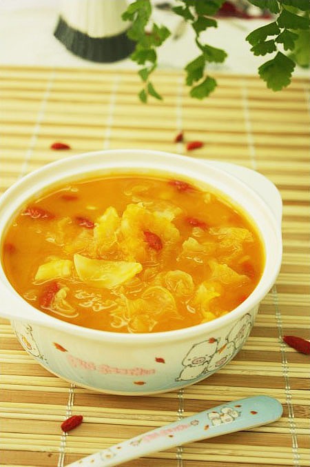 用料:南瓜500克,银耳10克,干百合20克,枸杞、白糖、湿淀粉适量;