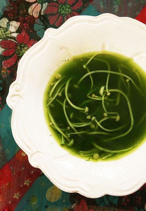 3、菠菜糊倒回锅中,加适量水,放入洗净的金针菇,煮至金针菇熟