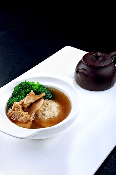 6.捏好的丸子,放进蒸笼中去蒸熟。然后取一个小煲放入蒸熟的野菌狮子头,傍边放焯熟西兰花,在放入蒸熟的松茸,倒入调味好的松茸素高汤,将另一半松茸素高汤倒入紫砂壶中,一起上桌即可。