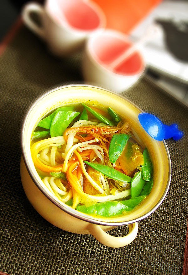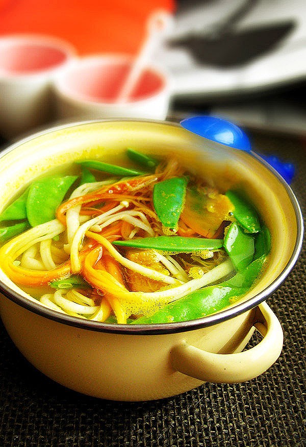 原料:南瓜400克、荷兰豆100克、金针菇250克、素高汤800克、清水600克、盐2克。