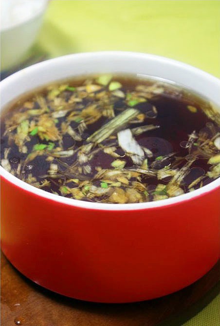 碗内放好葱花、酱油、花生油,当然要滚烫的开水趁热倒进去,汤上面翻滚着油花,葱花点缀就可以了。