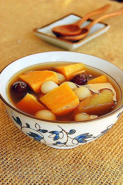 【用料】地瓜300克、老姜20克、去核红枣10颗、糯米小圆子50克、水适量、红糖适量