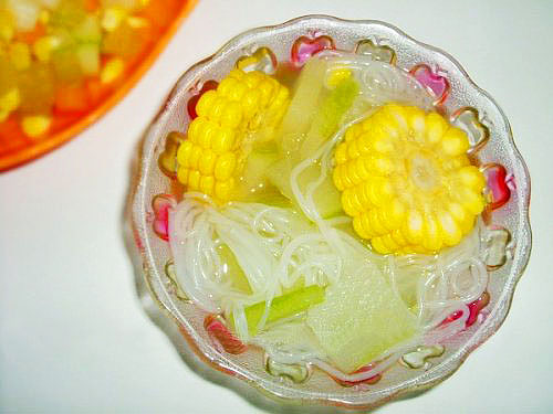 [做法]将玉米煮好后切成段,在煮玉米的汤中放入冬瓜和红薯粉丝,加入盐,至红薯粉丝熟,冬瓜变透明盛出,最后点两滴香油即可。