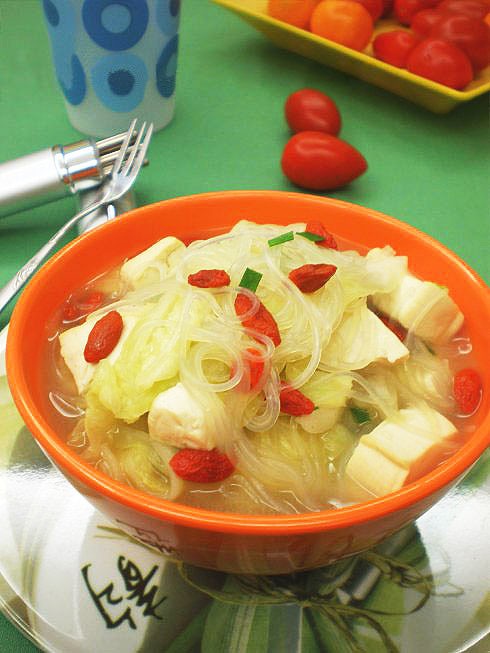 主料:嫩豆腐一块(重约150克),粉丝一把(重约40克),枸杞15克,素高汤适量,白菜适量;
