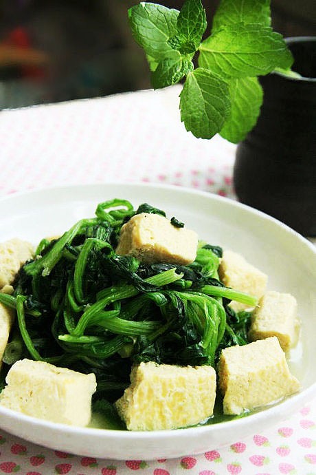 1、菠菜洗净后,放入沸水中焯半分钟后捞出,挤去水分,冻豆腐化冻后切块