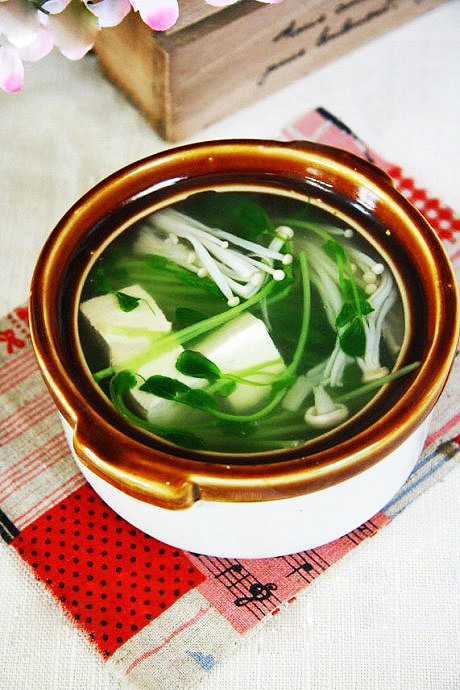 7、待汤再次煮滚沸腾,倒入豌豆苗即可关火,调入盐调味