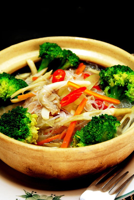 (9)净锅内加入少许精制油,放入红椒、扁尖笋、秀珍菇、胡萝卜、冬瓜煸香,加水略煮一会儿,放入粉丝、西兰花调味盐、素易鲜(代替味精)不勾芡,拌匀起锅,盛入煲内盘稍摆盘即可。