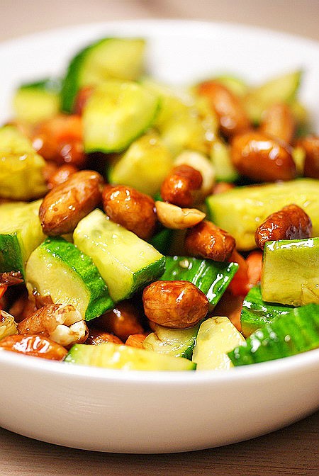 4、取出盘子后将花生放凉,然后加入调好的糖醋汁和切好的黄瓜丁,拌匀,稍入味即可食用。